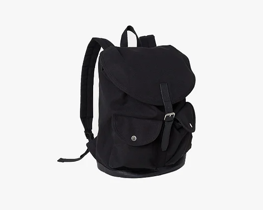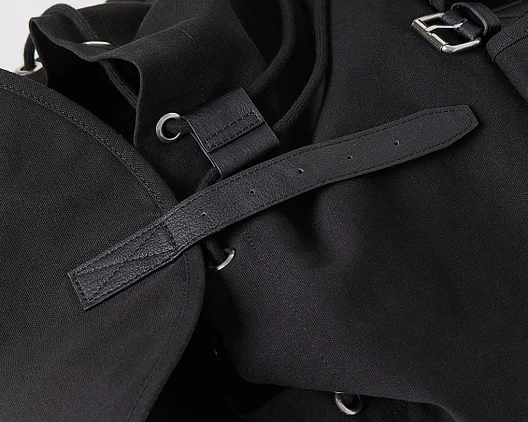 Cotton canvas backpack with imitation leather details, top handle and invisible drawstring, flap with adjustable metal buckle. Cotton shoulder strap is adjustable, with two external compartments with clamps and buckles and a cotton laptop compartment. Back and bottom cotton-filled. X28x43 18 centimeters.