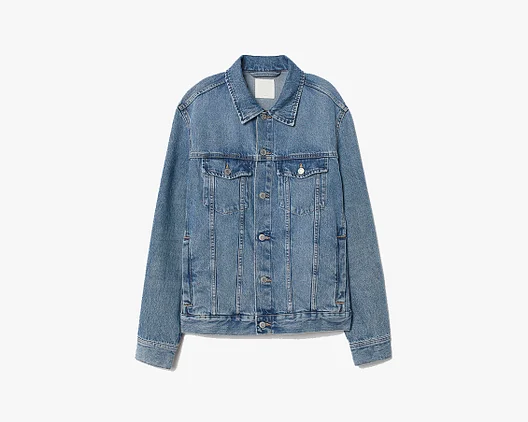 Jacket in washed denim with a collar and buttons down the front. Flap chest pockets with a button, welt side pockets, buttoned cuffs and an adjustable tab and button at the sides.
